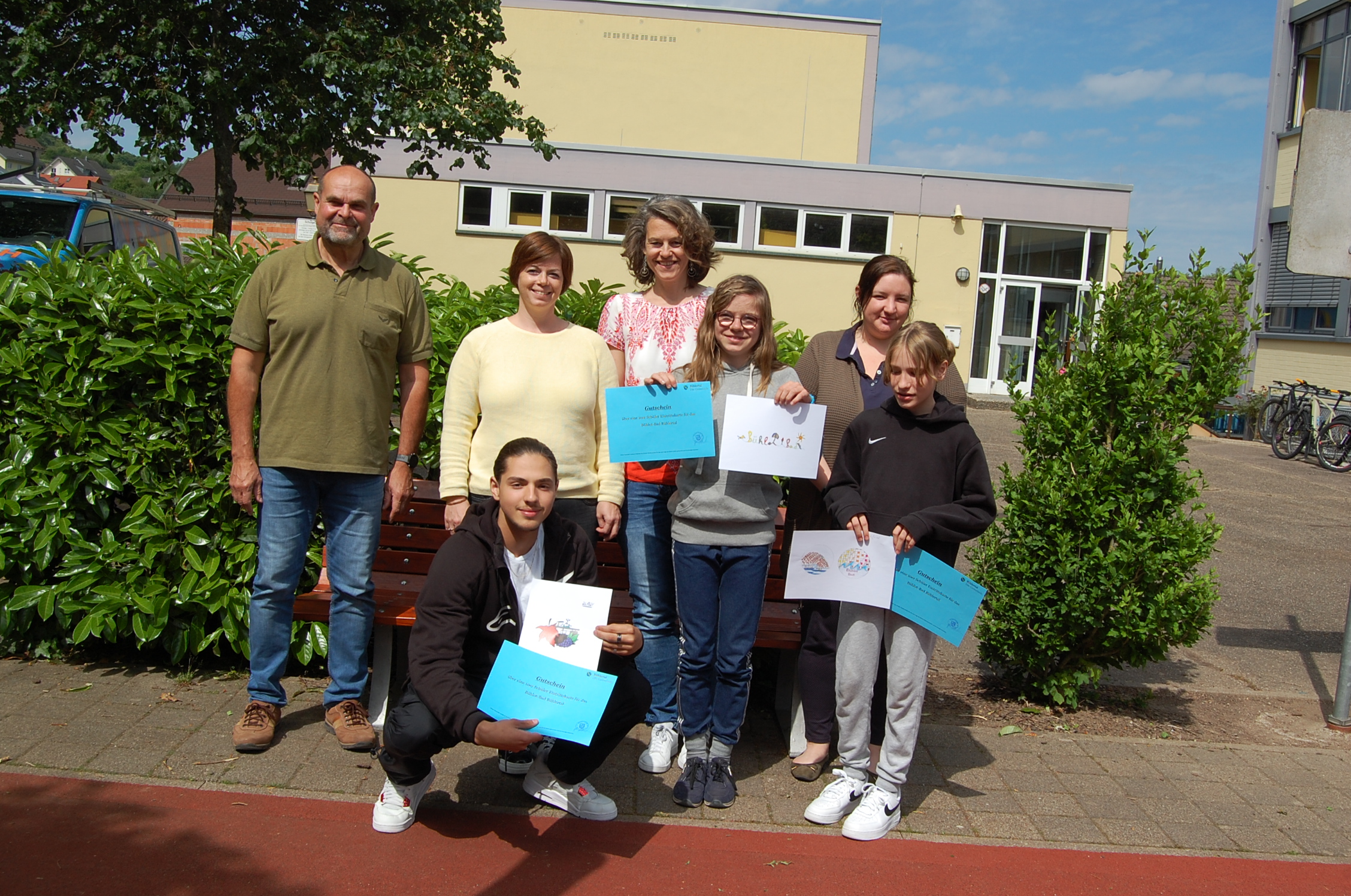 Ende Mai war es dann soweit – die Gewinnerinnen und Gewinner standen fest. Frau Vandersee von der Gemeinde Bühlertal konnte Theresa Schmidt und Emily Seifried aus der Klasse 7a, sowie Noah Roig Darby aus der Klasse 8b die Preise für das jeweils beste Logo in Form von Gutscheinen für den Schwimmbadeintritt überreichen.