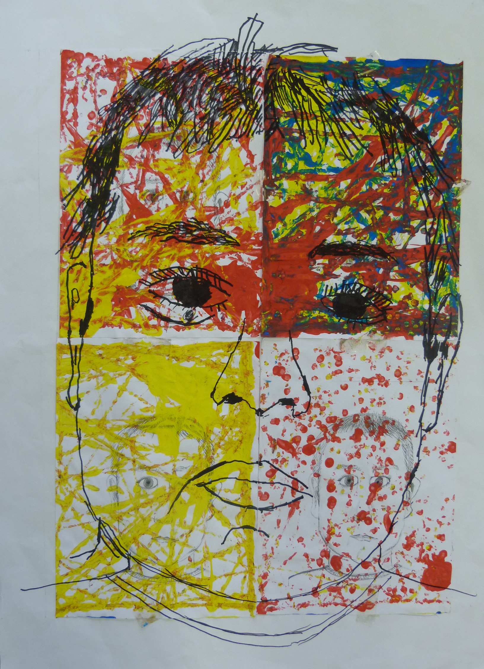 Bei dieser Arbeit stellten die Schülerinnen und Schüler Selbstporträts her, die mit den Grundfarben experimentell bearbeitet wurden.
