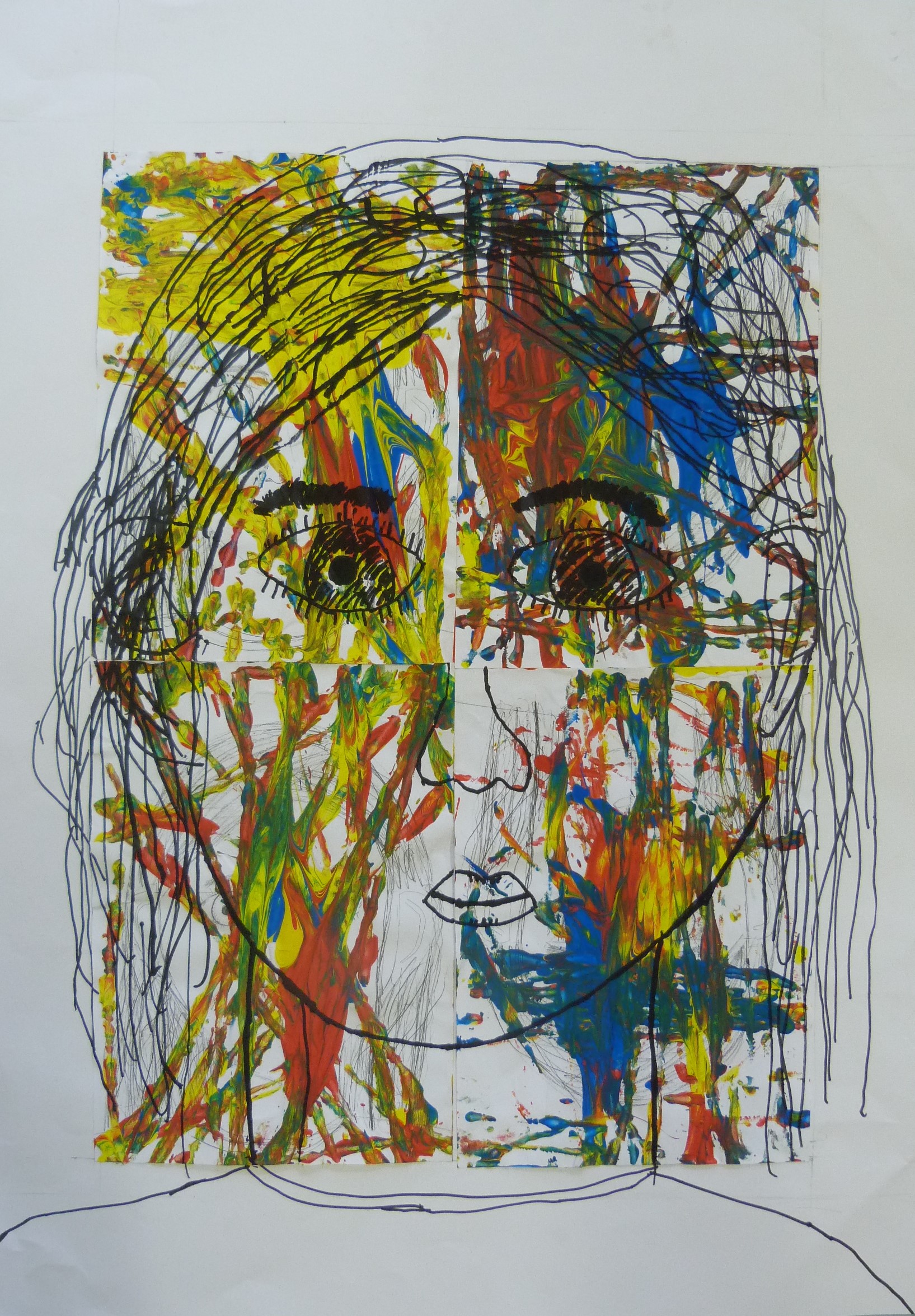 Auf dieses Bild zeichneten die Schülerinnen und Schüler nochmals sich selbst. Dadurch werden zum einen die vier einzelnen Porträts miteinander verbunden, zum anderen erhält das Bild eine Tiefenwirkung, die zum Entdecken einlädt.