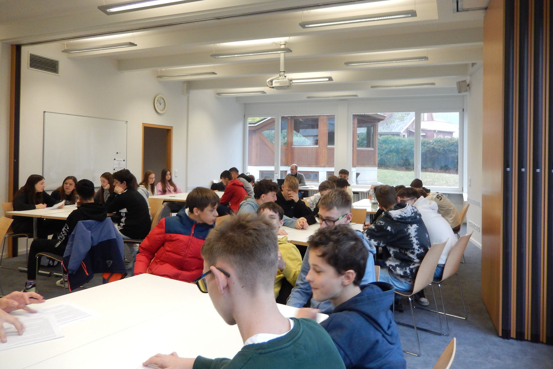 Am 6.12. trafen wir, die Klassen 9a und 9b, uns um 11.20 Uhr am Bühler Bahnhof und begannen dort unsere Reise. Ziel war das Studienhaus Wiesneck in Himmelreich, das ist ein Institut für politische Bildung. Begleitet wurden wir von den Lehrkräften Herr Eichelberger, Frau Bürkle und Herr Baumann. Nach einem kleinen Fußmarsch in Himmelreich vom Bahnhof zum Studienhaus Wiesneck mussten wir sehr schnell unser Gepäck auf die zugeteilten Zimmer bringen. Es gab Doppel- und Einzelzimmer, alles war sehr schön eingerichtet, so dass wir uns wohl fühlen konnten. Bereits um 14.30 Uhr begann die erste Unterrichtseinheit. Frau Geck von der Universität Freiburg brachte uns bei, was Gleichheit, Toleranz und Vielfalt bedeuten und wir wurden mit der Frage konfrontiert, welche Werte uns wichtig sind. Zu ihrem Programm gehörten eine Powerpoint, Gruppenaufgaben und ein spannendes Quiz, bei dem die Gruppe mit der höchsten Punktzahl eine kleine Belohnung gewinnen konnte.