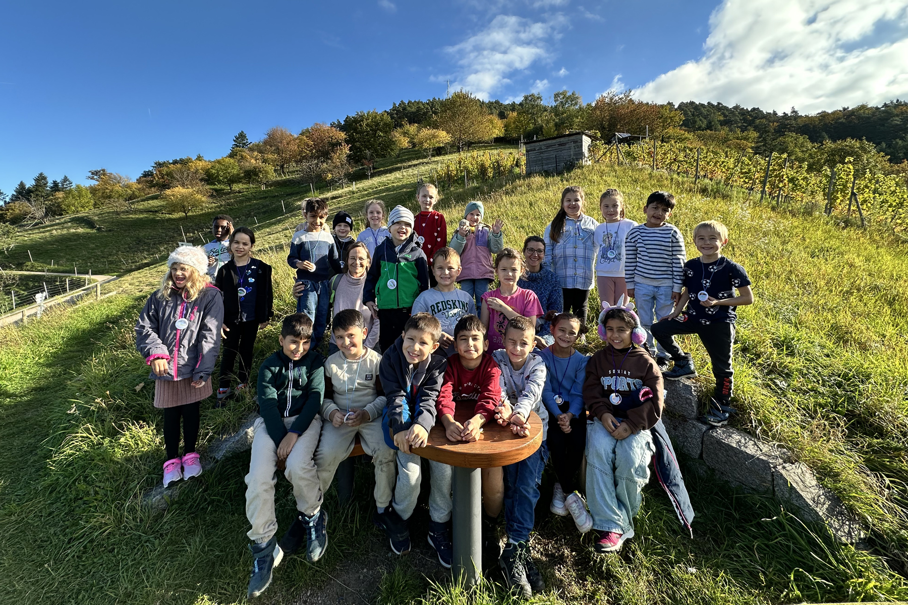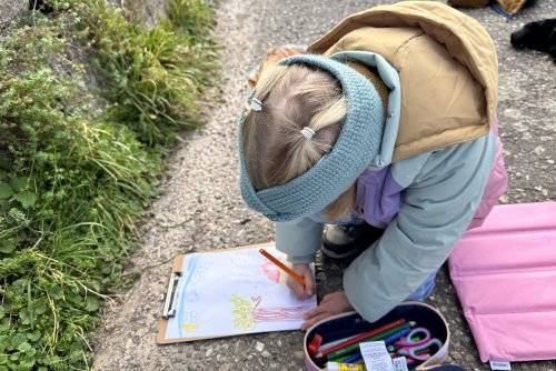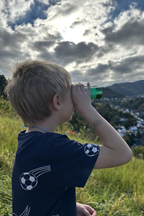Zum ersten Mal führte die 1. Klasse der FHS am 06.10.25 ein Naturparkmodul durch.Unter dem Motto "Wir lernen den Naturpark kennen" besuchte Frau Kunz die erste Klasse in ihremKlassenzimmer und stellte ihnen das Naturparkauge vor, erzählte, was der Naturpark ist und was esda so alles gibt.Jedes Kind bastelte einen Namensbutton und ein Fernrohr, mit dem es dann an derbevorstehenden Wanderung zum Engelssteig seinen eigenen Augenblickpunkt suchen durfte.Am 14.10.25 wanderten die Kinder mit ihren Klassenlehrerinnen Frau Kirn und Frau Groh undder Kooppartnerin Frau Kunz bei gutem Wetter zum Engelsteig.Nach einem kurzen Abstecher in die Geschäftsstelle des Naturparks, wo man Herrn Dunker, den Chefdes Naturparks, überraschen wollte, ging es den Berg zum Augenblickpunkt hinauf.Unterwegs besuchten die Kinder die Alpakas, die Schafe und Ziegen, die für die Landschaftspflegerund um den Engelssteig zuständig sind.Das Suchen jedes einzelnen Augenblickpunktes war für die Kinder etwas ganz Besonderes, denn dasSchauen durch das Fernrohr war etwas ganz anderes, wie es sich manch einer vorgestellt hatte.Nachdem alle Augenblickpunkte gemalt waren, machte sich die erste Klasse auf den Heimweg.Es war ein schöner, sonniger und spannender Vormittag.Ein Dankeschön an Frau Kunz, die diese Tage mit den Kindern durchgeführt hat.
