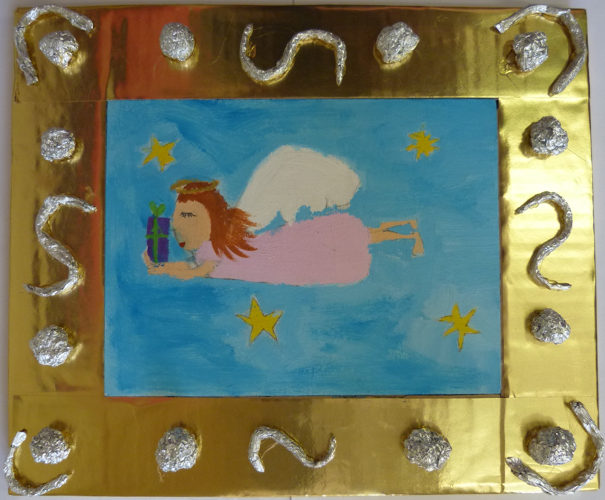 Danach malten sie wie der große Meister ihre eigenen Engel … und zwar auf Holzplatten. Für ihre Engelsdarstellungen fertigten die Kinder anschließend Rahmen, die sie nach dem Prinzip der Symmetrie mit Gold- und Silberfolie verzierten.