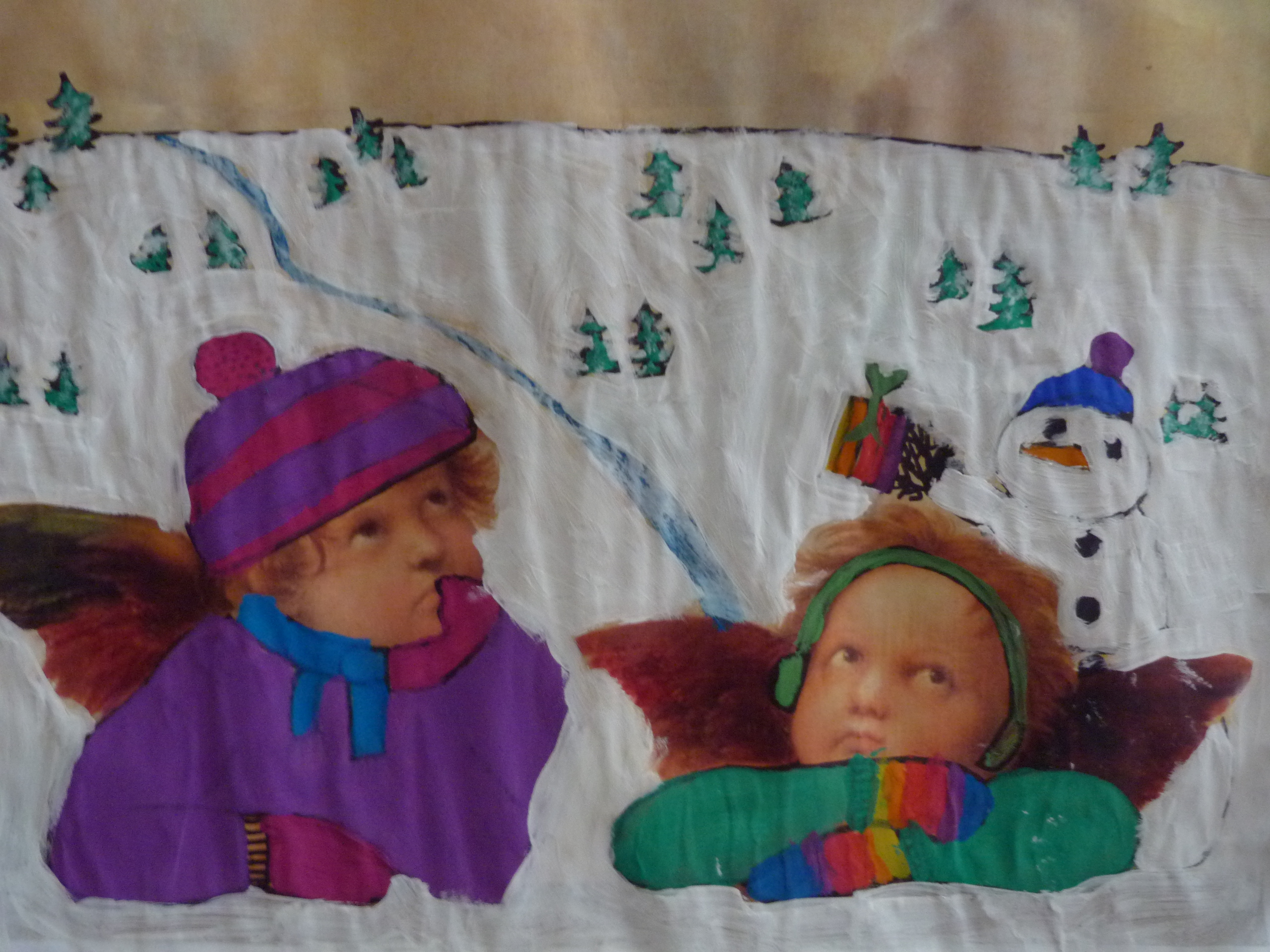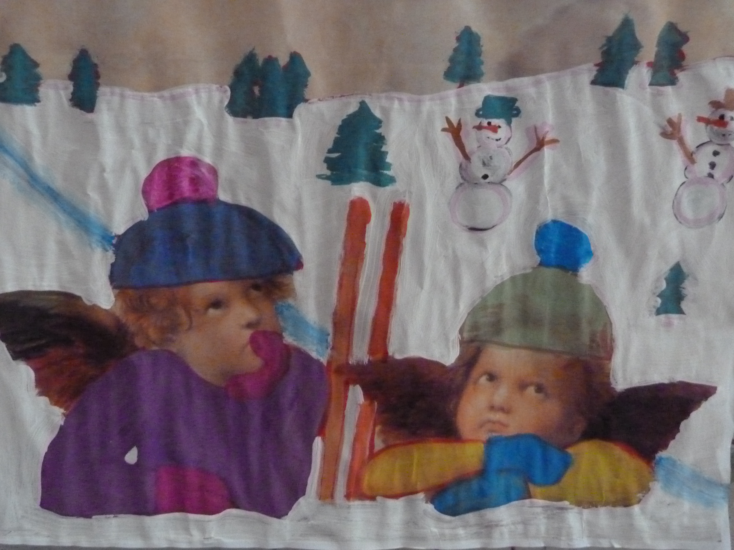 Die zweite Arbeit „Raffael und Ich“ beinhaltete die Aufgabe, die Engel von Raffael durch Übermalen zu verfremden und dadurch eine neue Bildaussage zu gewinnen. Die Kinder einigten sich darauf, die spärlich bekleideten Engel in die aktuelle Jahreszeit zu versetzen und entsprechend der aktuellen Temperaturen wetterfest zu kleiden.
