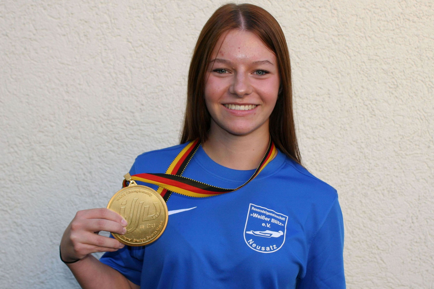 Sportlerin Michelle Armbruster, die im August 2023 mit ihrem Partner bei der Weltmeisterschaft im Rollenrodeln in Neusatz die Goldmedaille gewann, wurde kürzlich mit dem Ehrenpreis der Gemeinde Bühlertal ausgezeichnet.