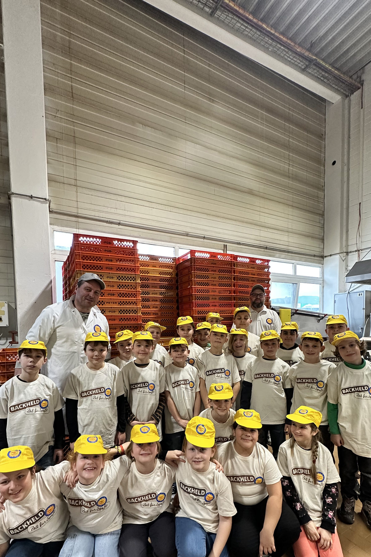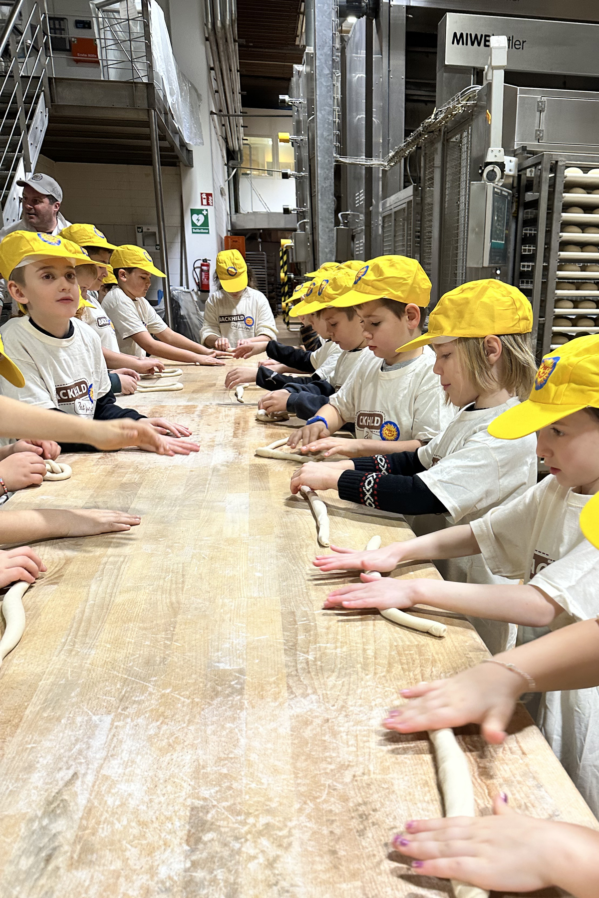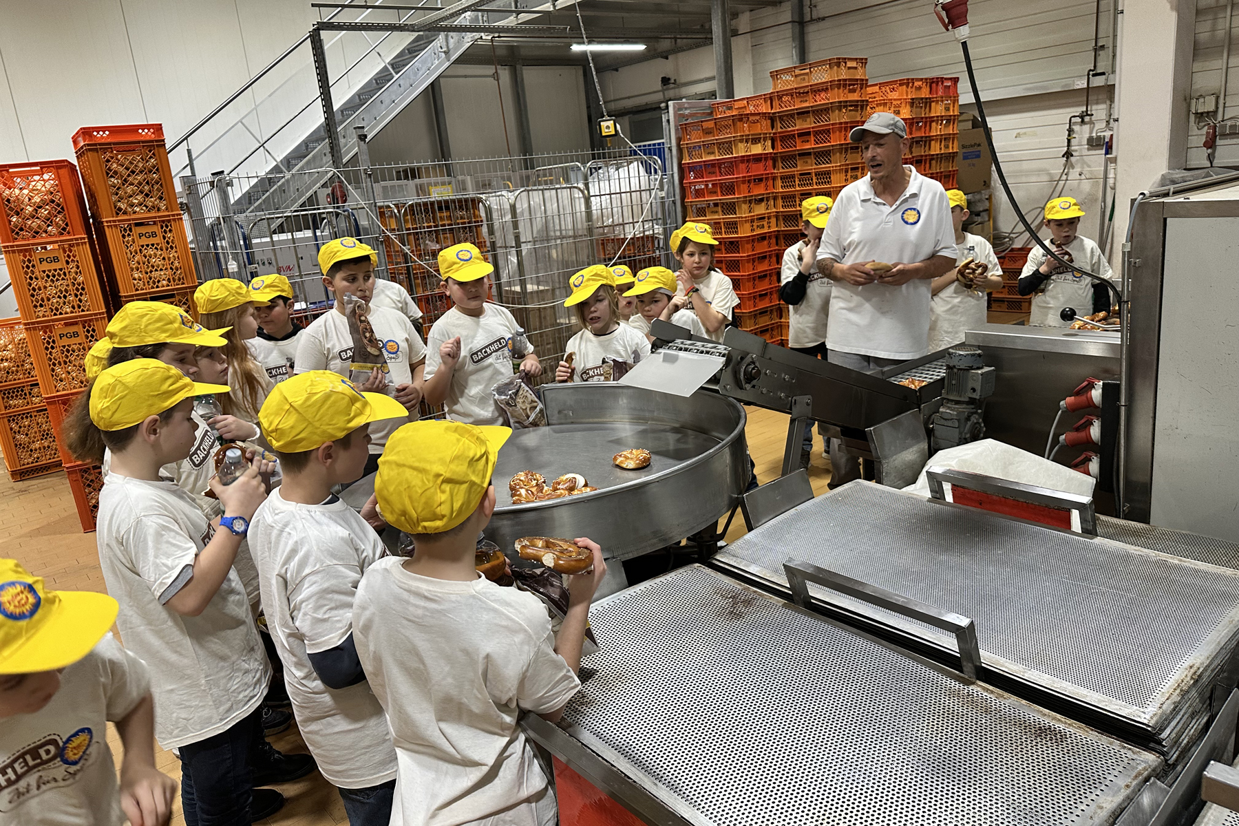 Doch wie die Müller und Bäcker heute arbeiten konnten die Kinder bei einem weiteren Ausflug am 14.01.26 erleben. Die Klasse machte sich mit ihrem Lehrer Herr Hoferer und der Projektleiterin Frau Kunz auf den Weg nach Vimbuch zu der Produktionsstätte der Bäckerei Peter’s gute Backstube. Die Kinder hatten sich viele Fragen überlegt. Welche Arbeitsschritte werden heutzutage durch Maschinen übernommen? Wie kommt heute das Korn in die Bäckerei? Wie hat sich der Beruf des Müllers und des Bäckers verändert? Wie sehen die moderne Produktionsanlagen aus? Wie viele Brote, Brezeln und Brötchen werden am Tag produziert?