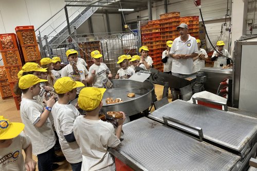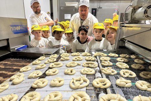 Dann ging es los auf den Rundgang durch die Hallen. Die beiden Bäckermeister Michael und Martin erklärten den Kindern alles sehr genau. Es war echt interessant zu sehen, wieviele Brötchen auf einmal von der Maschine geformt wurden oder wie viele Berliner im Fettbad schwimmen können und wie schnell die Marmelade in den Berliner kommt. Auch das leibliche Wohl kam nicht zu kurz. Nach der Besichtigung wurden alle Besucher verwöhnt. Jeder konnte sich einen Berliner aussuchen und wer es lieber deftig wollte, konnte eine Brezel essen.