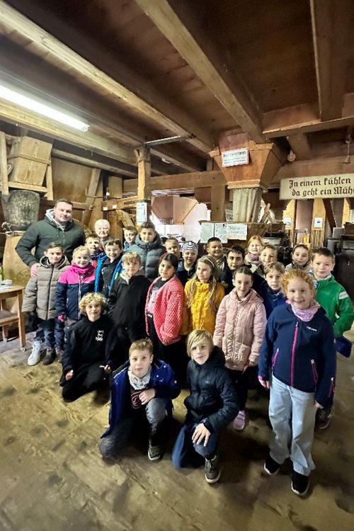 Heute besuchte die 3. Klasse mit ihrem Klassenlehrer Herrn Hoferer und Frau Kunz nach einer kleinen Wanderung die Rohrhirschmühle in Altschweier. Es ist eine sehr alte Mühle, in der man noch viel über das alte Handwerk des Müllers erfahren konnte. Frau Venz, die Besitzerin der Mühle, erwartete die Gruppe schon am Eingang. Zuerst gab es viel Geschichtliches zu der Mühle zu erzählen, das für die Kinder sehr interessant war, denn vieles kannten sie gar nicht. Es war schon beeindruckend, welche Wege ein Getreide hinter sich hatte, bis es zu Mehl verarbeitet werden konnte. Die einzelnen Arbeitsschritte hierzu zeigte Frau Venz in der Mühle. Das Getreide wurde früher in Walzenstühlen aufgebrochen und zerkleinert. Vom Walzenstuhl ging das Mahlgut in die Plansichter. Das sind große, auf Stäben angebrachte, schwingende Siebschränke. Darin sind Siebe mit unterschiedlichster Maschenweite angeordnet, die das Mahlgut nach seiner Teilchengröße sortieren. Das bereits angefallene Mehl wurde „abgezogen“, wie die Müller sagen, und ins Mehlsilo eingelagert. Damit sich die Kinder das alles noch genauer vorstellen konnten, zeigte ihnen Frau Venz ein Modell, an dem man genau den Ablauf sehen konnte. Am faszinierendsten fanden die Kinder den Motor der Mühle, das große Wasserrand, das die Mühle in Bewegung setzt. Sorgen wurden sich auch gemacht, denn was passierte, wenn es nicht genug Wasser zum Antreiben des Rades gab? Auch auf diese Frage hatte Frau Venz eine Antwort. Mit einem großen Schatz an neuen Informationen machte sich die Klasse danach wieder auf den Heimweg. Ein herzliches Dankeschön geht an Frau Venz. Wir freuen uns schon auf den nächsten Besuch.