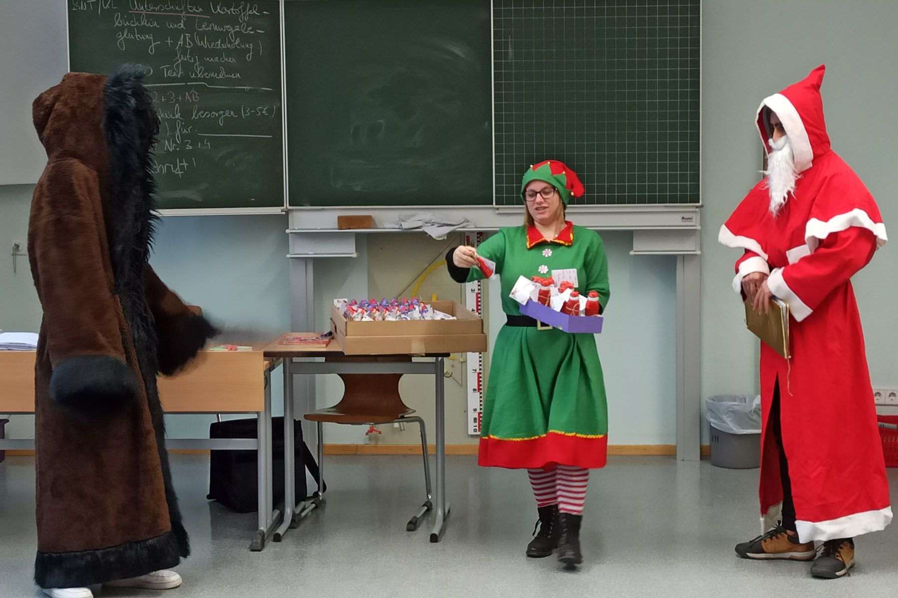 Für die Kinder und Jugendlichen der Grund- und Realschule kam der Nikolaus mit Musik und Gedicht in jede Klasse und überreichte Schokonikoläuse, die zuvor von den Kindern für ihre Freunde und Freundinnen bei der SMV gekauft werden konnten. Die Schüler der SMV und Frau Heinkelein als SMV-Lehrerin organisieren diese Aktion, die von den Schülerinnen und Schülern immer gerne angenommen wird.
