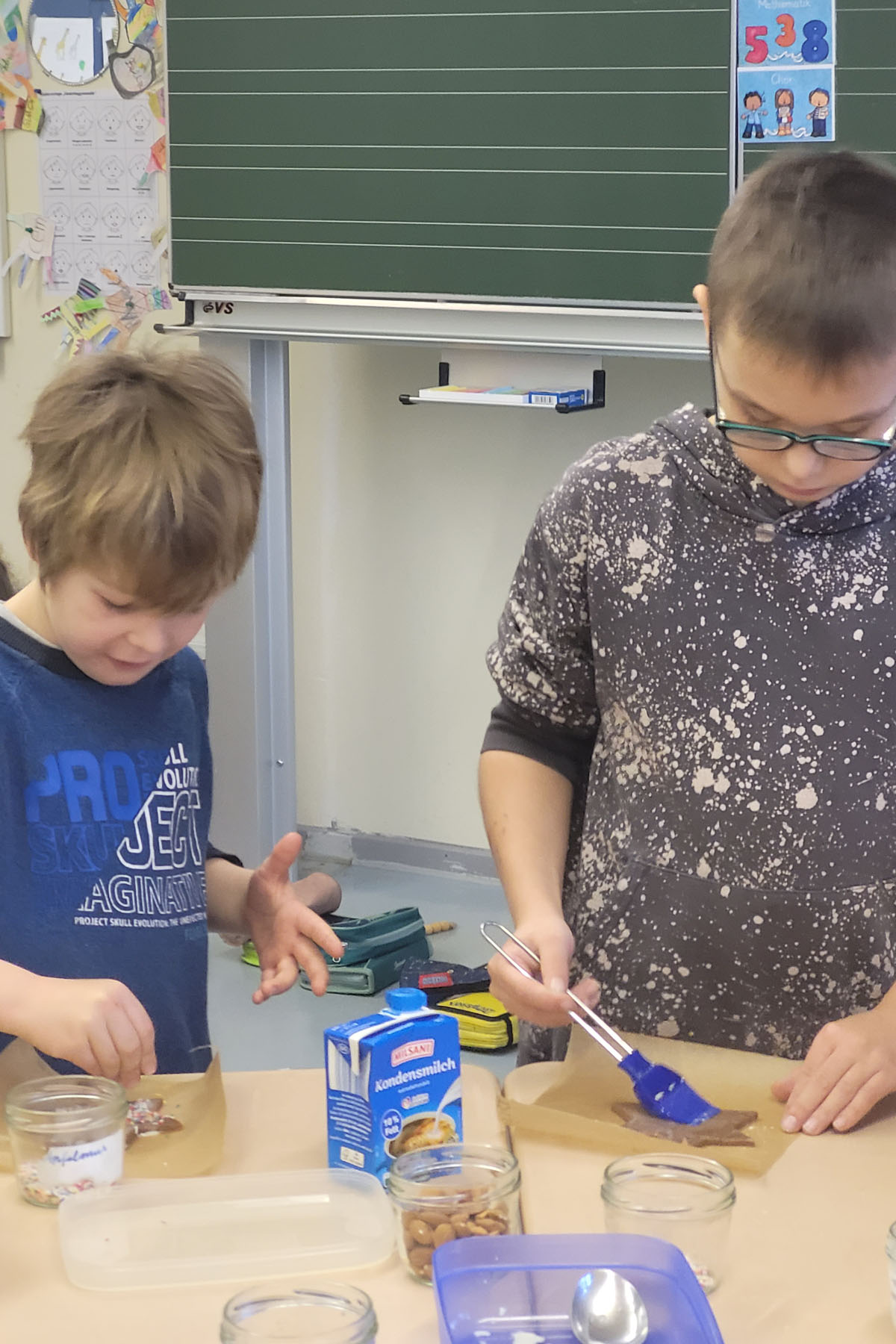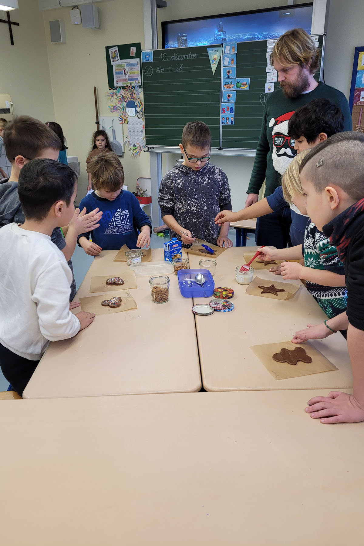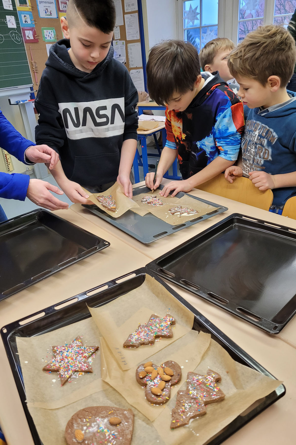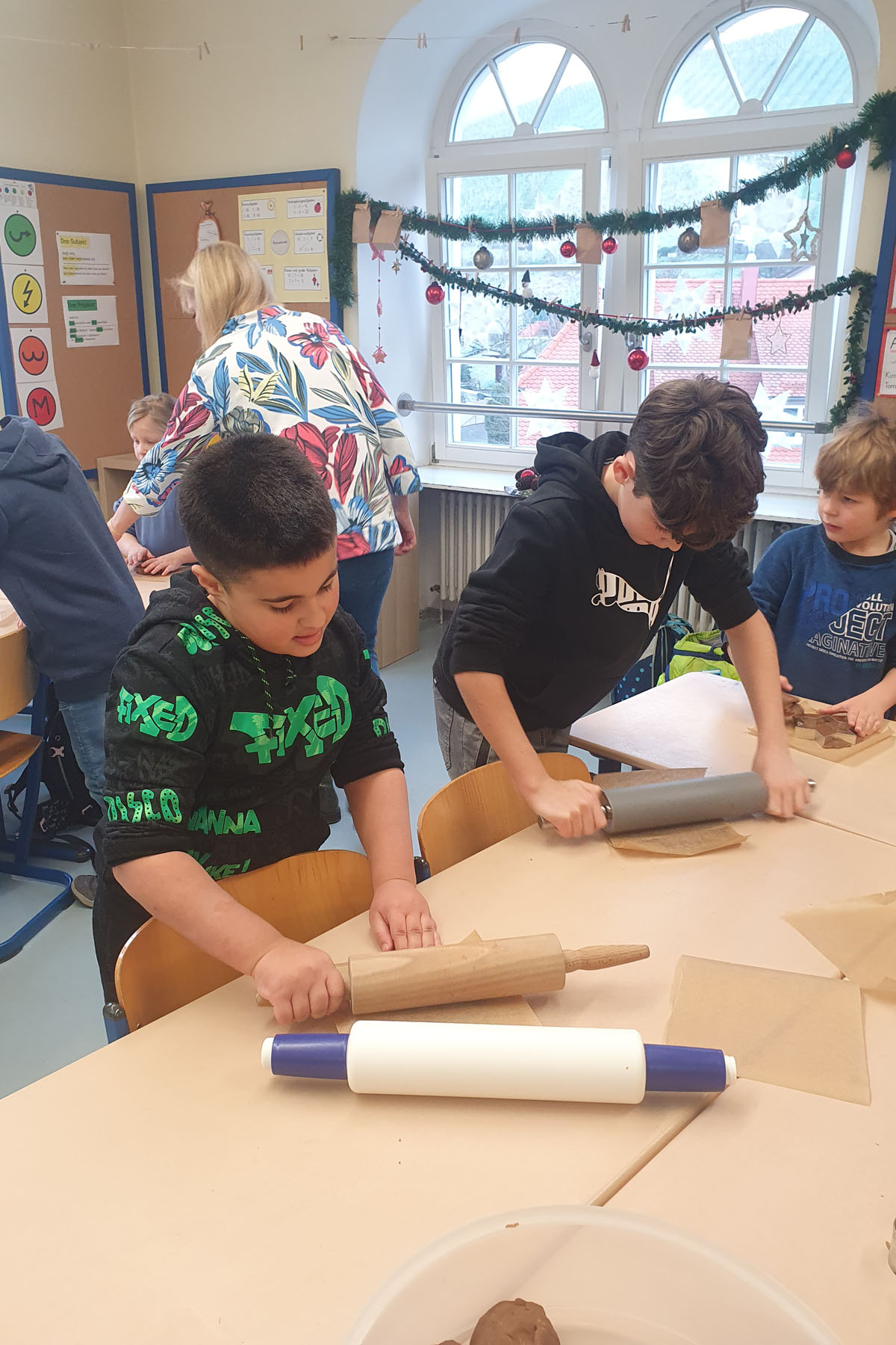 Am Dienstag der letzten Adventswoche durften sich die Erstklässler der Franziska-Höll-Schule auf Projektstunden mit ihren Patenschülern aus Klasse 4 und ihren Lehrkräften Annika St. Pierre, Ellen Groh und Ulrike Grindler freuen. In Gruppen aufgeteilt durchliefen die Schüler nacheinander drei Stationen mit interessanten Themen: Zum Einen bastelten die Erstklässler mit ihren Paten aus der vierten Klasse zuerst ein Weihnachtsmotiv mit Fingerfarben und gestalteten diesen Fingerdruck mit Filzstiften aus. Dann ging es zur Lesespurgeschichte. Dort las der Viertklässler vor und gemeinsam lösten die Kinder ein Rätsel. Schließlich kamen die Schüler zur Backstation. Dort kneteten sie einen Lebkuchenteig, wellten diesen aus und stachen eine Lebkuchenfigur aus. Diese wurde noch mit Mandeln oder buntem Zucker verziert. Viele Elternhände unterstützten die Lehrkräfte der beiden Klassen beim Ausstechen und Auswellen, Backen, Drucken oder beim Gestalten. Glücklicherweise waren wieder klassenübergreifende Projekte möglich, so dass die zwei abwechslungsreichen Unterrichtsstunden viel zu schnell vorbeigingen. Den helfenden Eltern sagen die Klassen 1a, 1b,4 und die Lehrkräfte ein herzliches Dankeschön!