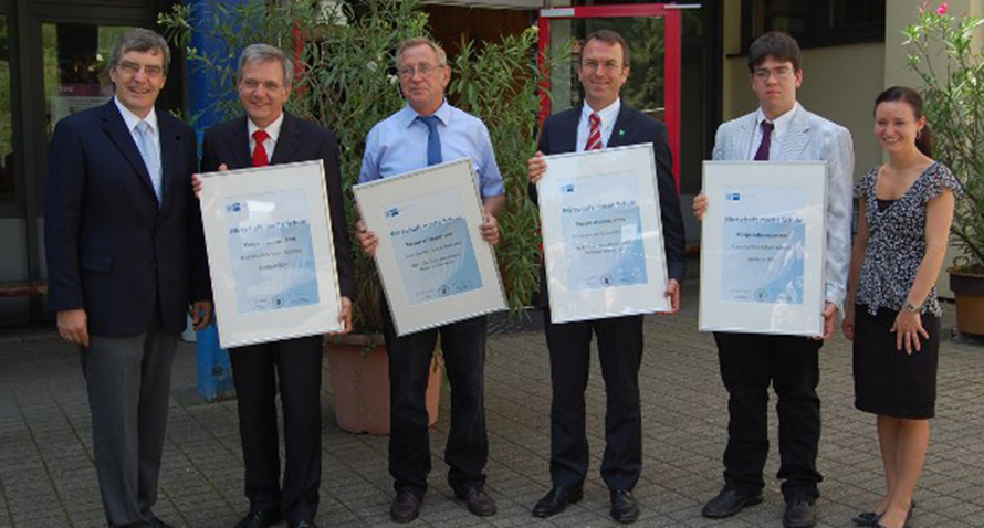 28. Juni 2012: Die Vertragsunterzeichner v. l.: Hans-Peter Braun (Bürgermeister Bühlertal), Karl Langangki (Sparkasse Bühl), Manfred Dörner (Rektor), Bernhard Ibach (AOK), Michael Naber (Schülersprecher), Annemarie Herzog (IHK Karlsruhe)